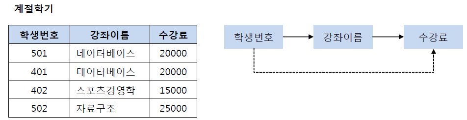 위와 같은 테이블에서 학생 번호는 강좌 이름을 결정하고 있고, 강좌 이름은 수강료를 결정하고 있다. 따라서 제3 정규화를 한다면 다음과 같다.